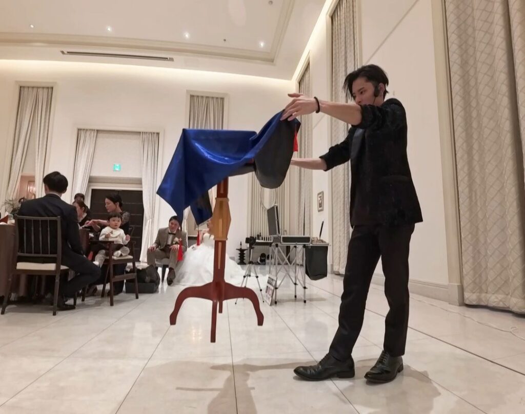 今回は新郎新婦様からのご依頼で、披露宴の余興として約30分のマジックショーを行わせていただきました。